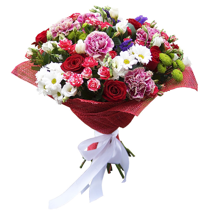 Букет состоит из 5 роз, 5 кустовых роз, 5 гвоздик, 5 веток хризантем, 5 эустом, 2 статица, красивая упаковка, атласная лента.