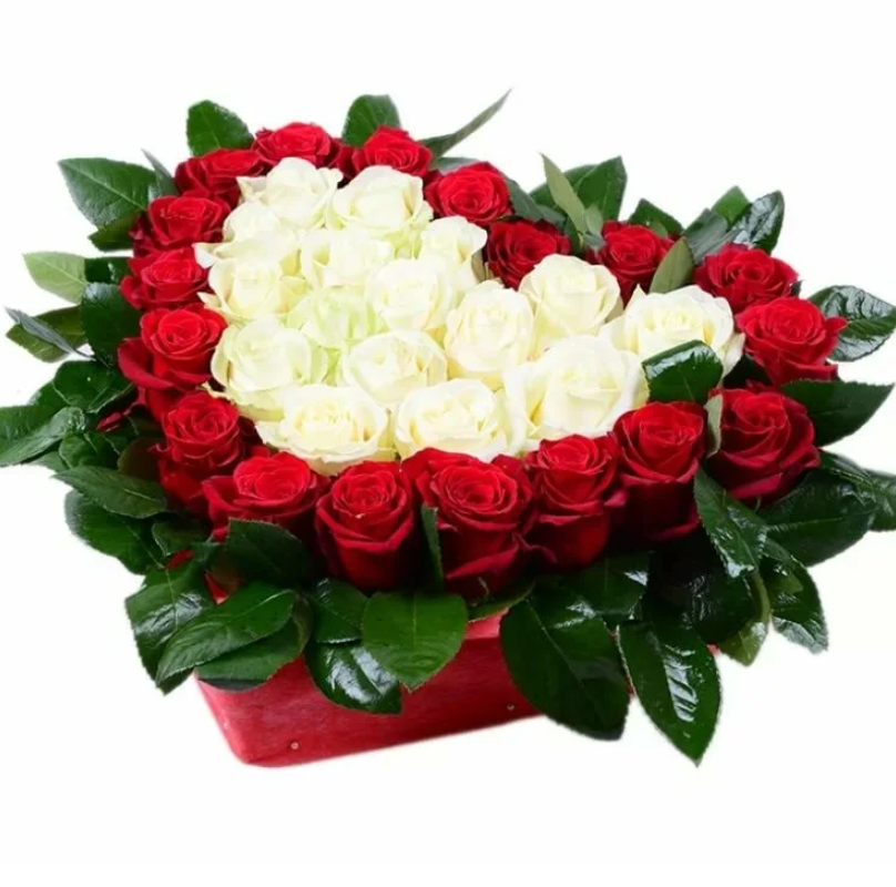 35 красных и белых роз, салал, коробка в виде сердца.