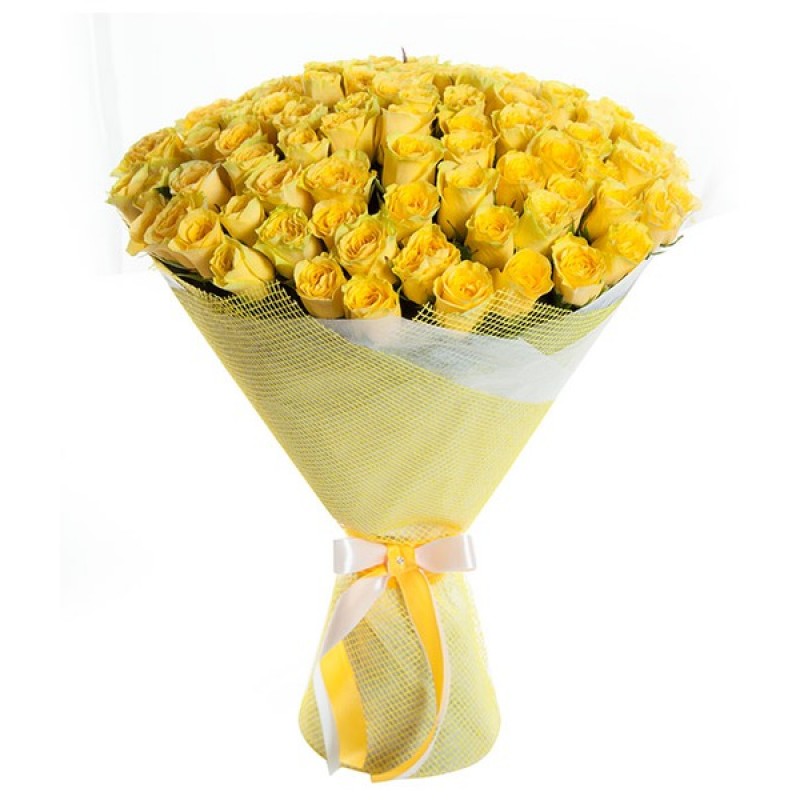 Букет состоит из 75 желтых роз, красивая упаковка, атласная лента.